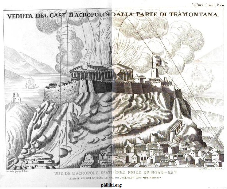 Le bombardement du Parthénon par les Vénitiens – il avait été transformé en mosquée par les Ottomans et servait de poudrière aux troupes ottomanes, lors de la guerre turc-vénitienne. Gravure vénitienne du 17ème siècle. Image tirée de la double page d’un livre du 19ème siècle « Athènes aux XVe XVIe et XVIIe siècles par le Cte de Laborde »-un clic pour agrandir