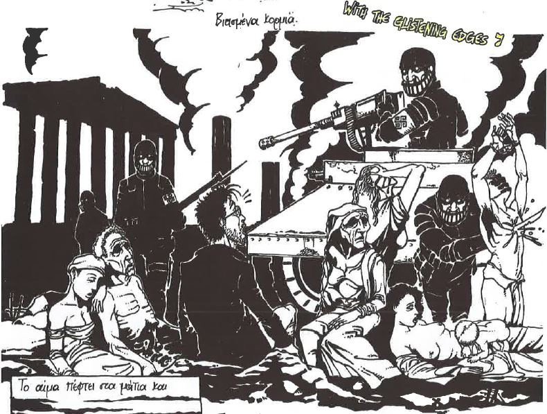 Les auteurs imaginent une Athènes dévastée par « les événements ». Vision d’anticipation cauchemardesque ponctuée de clins d’oeil à la Grèce contemporaine.