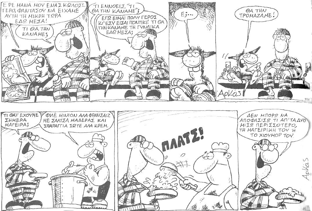 Arkas a commencé à diffuser ses dessins dans les années 1980 dans le magazine de BD grec ΒΑΒΕΛ (BABEL), que l’on pourrait situer entre Fluide glacial et le journal de Tintin.
