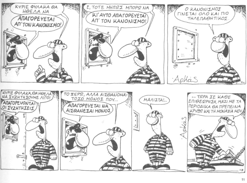 Le prisonnier : « Monsieur le gardien je voudrais… » Le gardien: « C’est interdit par le règlement. » Le prisonnier : « Ah, donc puis-je… » Le gardien : « Ca aussi c’est interdit par le règlement. » Le prisonnier, face au lecteur : « Le règlement devient de plus en plus télépathique. » – Le prisonnier : « Monsieur le gardien je voudrais qu’on parle un peu. » Le gardien : « Les conversations sont interdites. » Le prisonnier : « Je sais mais je me sens si seul que… » Le gardien : « Il est interdit de te sentir seul. » Le prisonnier: « Bien!… Maintenant à chaque inspection, en plus des magazines je vais devoir aussi cacher ma solitude. » – traduction/adaptation P.L.