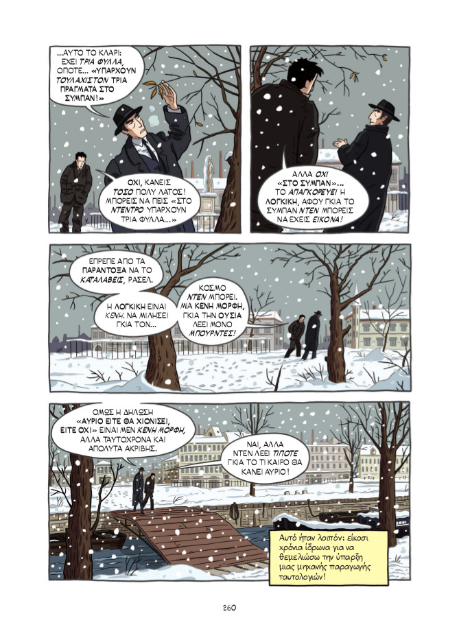 Avec son terrible accent autrichien (savoureux en grec), Ludwig Wittgenstein se fait fort de démontrer à Bertrand Russel que son travail de plusieurs décennies n’est que fadaises. Le drame. LOGICOMIX. Extrait de l’édition grecque – un clic pour agrandir.