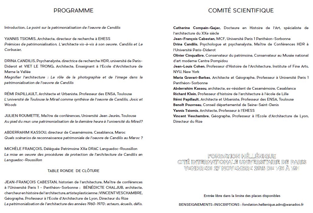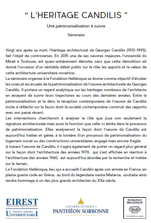 Un séminaire sur l’architecte grec Georges Candilis se tiendra à la Fondation hellénique, à la Cité universitaire internationale de Paris, le 27 novembre 2015, en coopération avec l’Université de la Sorbonne.