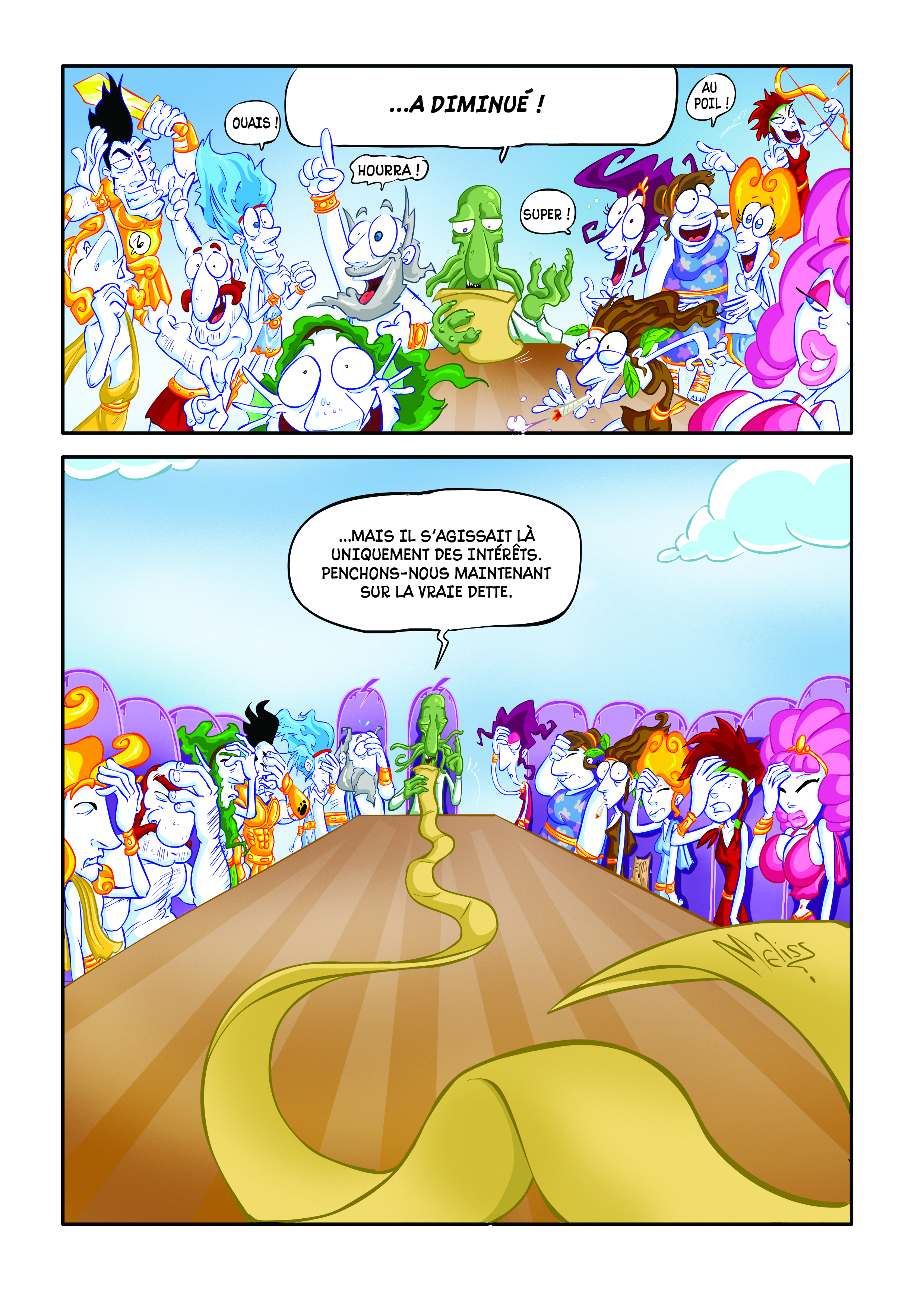 Imaginez l’Olympe ruiné par les dieux contraints de prendre des mesures plus catastrophiques les unes que les autres, comme réduire la vie des mortels, taxer les figures les plus connues de la mythologie grecque… tout cela pour servir une dette impossible à rembourser.