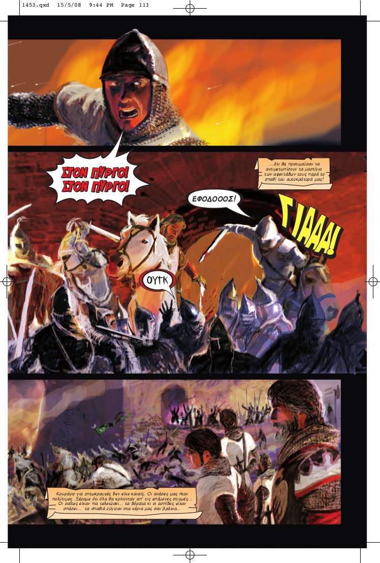 L’assaut des troupes ottomanes. Dans « 1453 » les Ottomans sont principalement appelés « Αγαρηνοί » (Agarini), nom par lequel les Byzantins désignaient souvent les Musulmans. Avec l’autorisation des éditions Anubis – un clic pour agrandir.