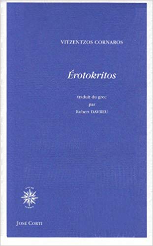 - celle de Robert Davreu, publiée par José Corti Editions en 2007 ; versifiée, cette traduction s’accompagne d’une préface et de commentaires qu’il serait difficile de ne pas paraphraser, tant ils sont intéressants et synthétiques (et d’un DVD de concert, remarquable bien que moins joyeux que d’autres interprétations populaires – « Erotokritos », avec un « k », ISBN-10: 2714309348, ISBN-13: 978-2714309341) ;