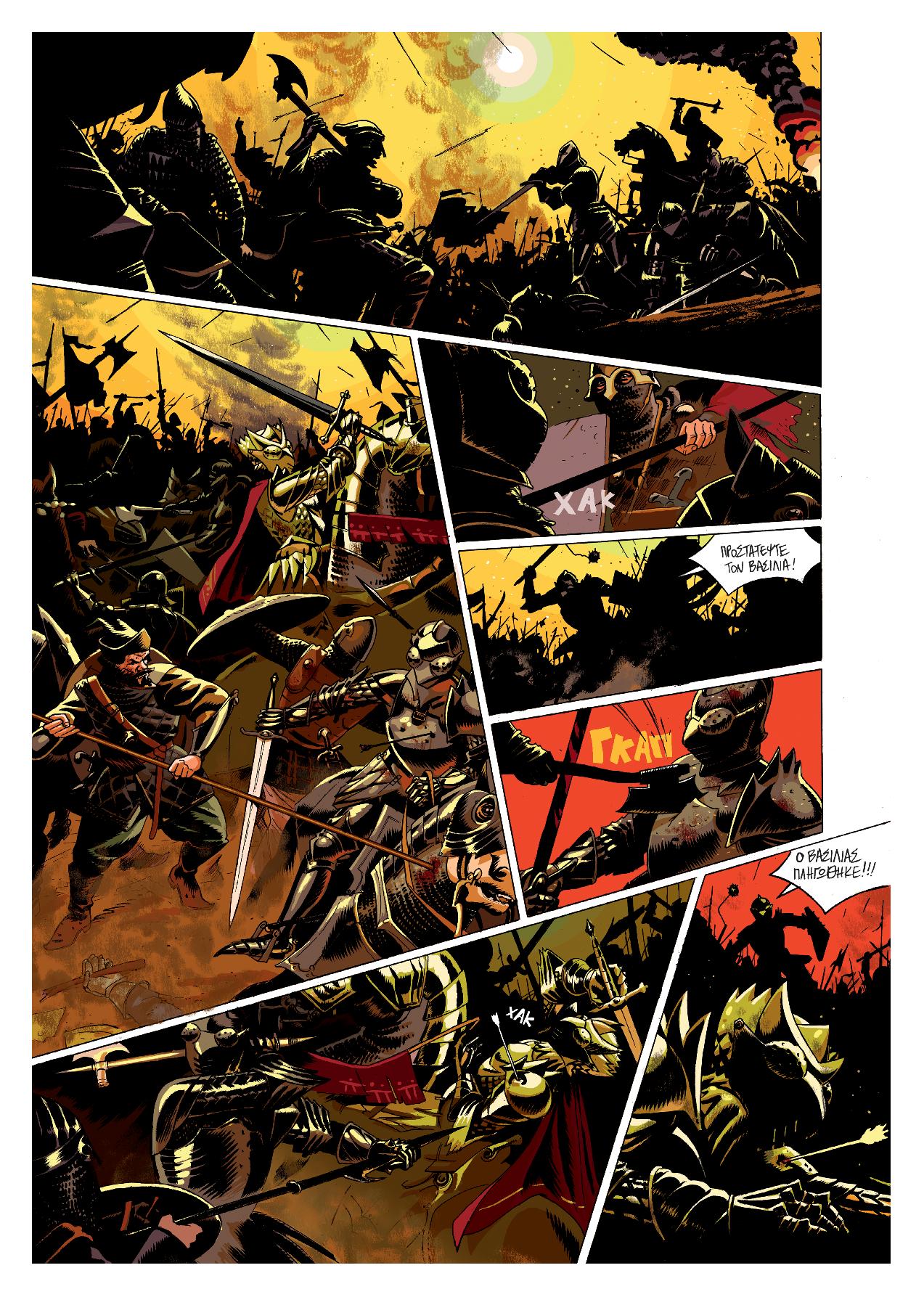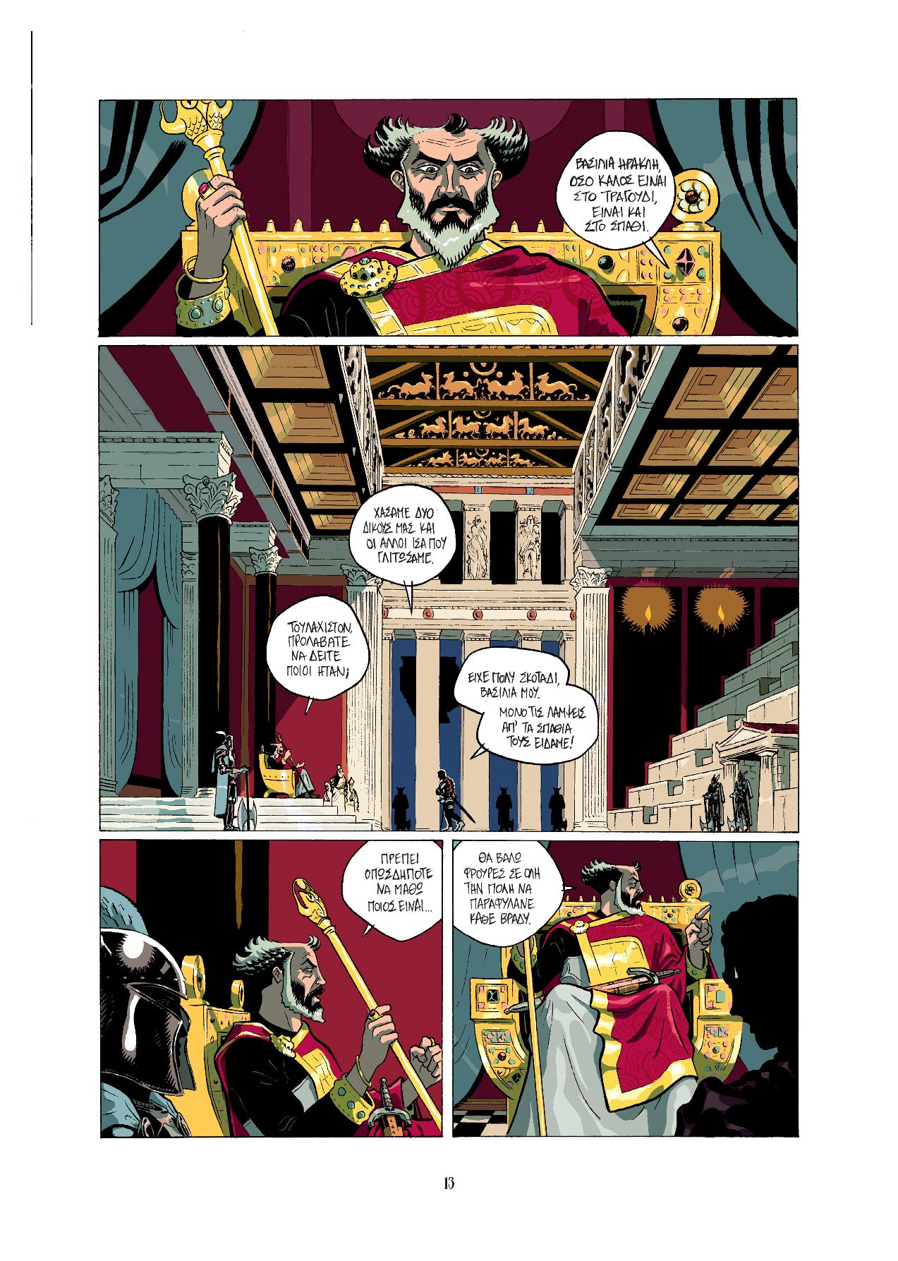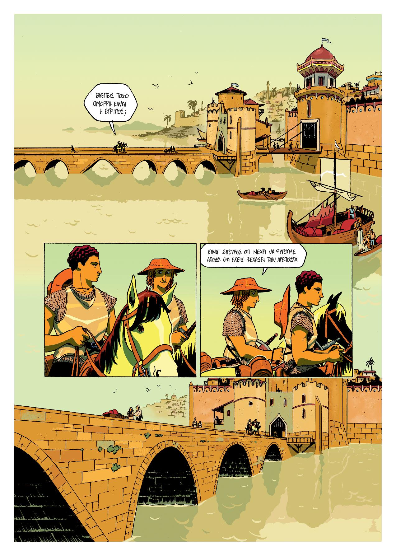 Les sources d’inspiration du dessinateur Giorgos Goussis puisent dans un mélange d’époques et de styles, répondant à l’imagination hybride de l’œuvre originale : les vêtements du roi et de sa cour sont de style gréco-byzantin, l’armement des Athéniens est de style Renaissance ; l’esthétique du Moyen âge occidental est bien présente. Pour le palais du roi d’Athènes, le dessinateur de la BD a pris modèle sur le projet avorté de palais sur l’Acropole, conçu par l’architecte allemand Karl Friedrich Schinkel pour le roi Othon de Grèce en 1834 (source : entrevue de Gio’rgos Gou’sis donnée à CNN Greece https://www.youtube.com/watch?v=kvJsEz3MBDY).
